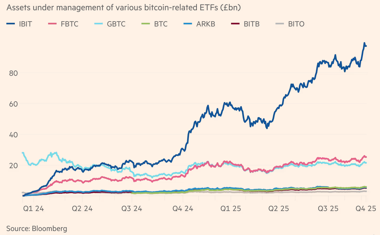 If IBIT crosses the US$100 billion mark, it will do so in record time, well ahead of the eight years it took the Vanguard S&P 500 ETF (VOO) to reach that milestone. It would also be rarefied air. Only 18 U.S.-listed ETFs currently manage more than US$100 billion. (Source: Financial Times)